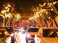 自貢網(wǎng)自貢網(wǎng)記者 李秋玥 宋姿熠 春節(jié)是中華民族最重要的傳統(tǒng)節(jié)日,對(duì)于中國(guó)燈城自貢來(lái)說(shuō),街頭巷尾少不了裝扮一番。近幾日走上街頭,市民們會(huì)發(fā)現(xiàn),主次干道兩旁相繼掛出了彩燈燈飾,系列夜晚景觀美不勝收,節(jié)日氛圍濃厚。 記者先后來(lái)到交通路、三八路等路段,只見(jiàn)象征著日子紅紅火火的串串燈籠高高掛起,大批彩色的燈球似乎一夜間“長(zhǎng)”滿枝杈,別有一番美感。 在時(shí)代大道,荷花圖案的燈飾錯(cuò)落有致,春暖花開(kāi)的氣息撲面而來(lái),步行