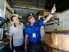 自貢網(wǎng)自貢網(wǎng)記者 鄭鑫玉 攝影 宋姿熠 實(shí)習(xí)生 饒珂菡7月23日下午,中伏的太陽炙烤著大地,地面翻涌著滾滾熱浪。在丹桂片區(qū),高新區(qū)城管執(zhí)法大隊(duì)丹桂中隊(duì)的執(zhí)法人員鄒杰和他的組員們已經(jīng)來來回回走了好幾遍。在完成又一次“巡街”后,隊(duì)員們的制服已經(jīng)被汗水濕透。鄒杰取下頭上的帽子,短暫的透了下氣,帽子里面已經(jīng)積滿了汗水?!斑@都是很正常的現(xiàn)象?!编u杰說,從早上6點(diǎn)半在綠盛農(nóng)貿(mào)市場(chǎng)集合開始,他們幾乎一直在室外,身上的