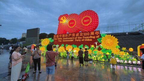 自貢網自貢網記者 周姝6月29日晚,陣雨過后天氣涼爽,自貢夏夜街道上的水汽讓人感到愜意。73歲的李銘退休后迷上了攝影,離家兩條街距離的南湖體育中心是他每天的“休閑場”,他也用相機默默記錄著這里的變化。今晚,李銘注意到,相機里常常出現(xiàn)的主角今天的“妝容”有些不同。一組長18米、高8米的大型燈組《百年華誕》映入眼簾:用彩燈藝術展示的100紅色數(shù)字造型震撼,“慶祝中國共產黨成立100周年”字樣大氣莊嚴;56根
