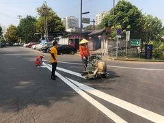 自貢網(wǎng)自貢網(wǎng)記者 繆靜 8月24日早高峰漸入尾聲,大安區(qū)仁和路上,一輛紅色的工程車上跳下來幾個桔色的身影。大安區(qū)市政設(shè)施管理所組織的道路標線施劃工程隊伍趁著太陽還不那么烈,開工了。 “來摸一哈地面,久了真遭不??!”即便為了搶抓溫度相對低一些的時段施工,此時的室外溫度也達到了四十幾度。負責劃初線的師傅黃述章剛蹲下來一會兒,豆大的汗珠從腦門滾落。按照安全生產(chǎn)要求,他還得把制服穿得嚴嚴實實。施劃前,大家須先