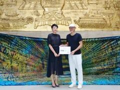 自貢網記者 周姝 近日,扎染藝術家丁永超先生向中國彩燈博物館捐贈其扎染作品《一燈》,博物館負責人為其頒發(fā)了作品收藏證書并表示感謝。 記者看到,用純棉布與染料制作而成的扎染作品《一燈》長6米、寬2.6米,作品以“燈”字為中心,用彩色染料形成的“光線”向外輻射,古樸雅致,大氣磅礴而又不失內斂含蓄,堪稱扎染精品。 丁永超表示,自貢燈會是自貢“大三絕”之一,扎染是“小三絕”之一,以“小三絕”的神秘展現“大