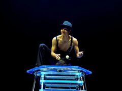 自貢網(wǎng)自貢網(wǎng)記者 周姝 6月15日,在自貢市雜技團排練廳內(nèi),青年演員劉杰忠正在一遍遍練習(xí)著他的新節(jié)目《手技砸球》。從三個球到八個球,一個個白球在他手中翻飛,時而讓大家拍手叫好,時而讓大家屏住呼吸。 已經(jīng)從藝17年的劉杰忠,自小就學(xué)習(xí)過雜技“拋草帽”,有些手技雜耍的基本功。2008年,市雜技團里安排劉杰忠練習(xí)丟球節(jié)目,一年半后,他便在雜技兒童劇《恐龍館奇妙夜》里飾演偷蛋的“盜龍”,深受觀眾的喜愛。 市雜
