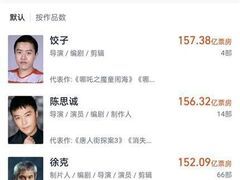 中國(guó)新聞網(wǎng)就在2月15日0時(shí)許,《哪吒之魔童鬧?!返膶?dǎo)演餃子超越陳思誠(chéng),登頂中國(guó)導(dǎo)演票房榜榜首。 中國(guó)導(dǎo)演票房榜榜單(圖源:燈塔專業(yè)版)據(jù)燈塔專業(yè)版最新數(shù)據(jù),截至2月15日0時(shí)許,導(dǎo)演餃子已憑借《哪吒》系列兩部電影《哪吒之魔童降世》《哪吒之魔童鬧海》拿下157.38億元票房成績(jī),超過陳思誠(chéng),成為中國(guó)導(dǎo)演票房榜第一名。隨后依次是陳思誠(chéng)、徐克。 值得一提的是,在該榜單當(dāng)中,大多數(shù)導(dǎo)演都是憑借兩位數(shù)的作品登上榜單