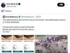 健康中國微信公眾號中新網(wǎng)1月3日電 1月2日,美國企業(yè)家埃隆·馬斯克在社交平臺X上指控美國總統(tǒng)拜登“叛國”。 圖片來源:社交媒體平臺X截圖2024年12月中旬,美國保守派媒體“每日連線”(Daily Wire)在社交平臺X上報(bào)道稱,拜登正在拍賣用于修建美墨邊境墻的專用材料,該墻在美國前總統(tǒng)特朗普第一任期內(nèi)開始修建,后來在拜登任期內(nèi)停止修建。這引發(fā)了對即將離任的拜登政府邊境政策的新一輪爭論。 有外媒報(bào)道指出,這篇報(bào)道