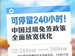 中國(guó)新聞網(wǎng)國(guó)家移民管理局12月17日發(fā)布公告,即日起全面放寬優(yōu)化過(guò)境免簽政策,將過(guò)境免簽外國(guó)人在境內(nèi)停留時(shí)間由原72小時(shí)和144小時(shí)均延長(zhǎng)為240小時(shí)(10天),同時(shí)新增21個(gè)口岸為過(guò)境免簽人員入出境口岸,并進(jìn)一步擴(kuò)大停留活動(dòng)區(qū)域。 符合條件的俄羅斯、巴西、英國(guó)、美國(guó)、加拿大等54國(guó)人員,從中國(guó)過(guò)境前往第三國(guó)(地區(qū)),可從24個(gè)?。▍^(qū)、市)60個(gè)對(duì)外開(kāi)放口岸中任一口岸免簽來(lái)華,并在規(guī)定區(qū)域停留活動(dòng)不超過(guò)24