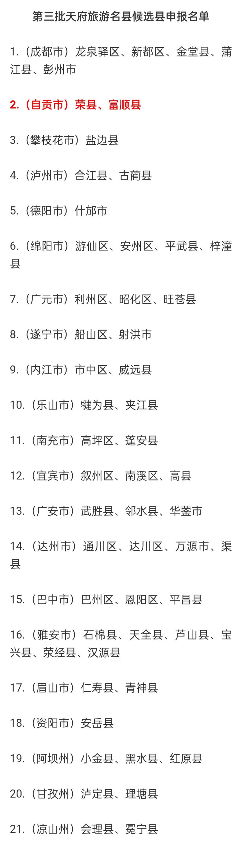 6月2日,省文化和旅游廳發(fā)布《關(guān)于第三批天府旅游名縣候選縣申報單位初審結(jié)果的公告》,富順、榮縣成功入圍申報名單。