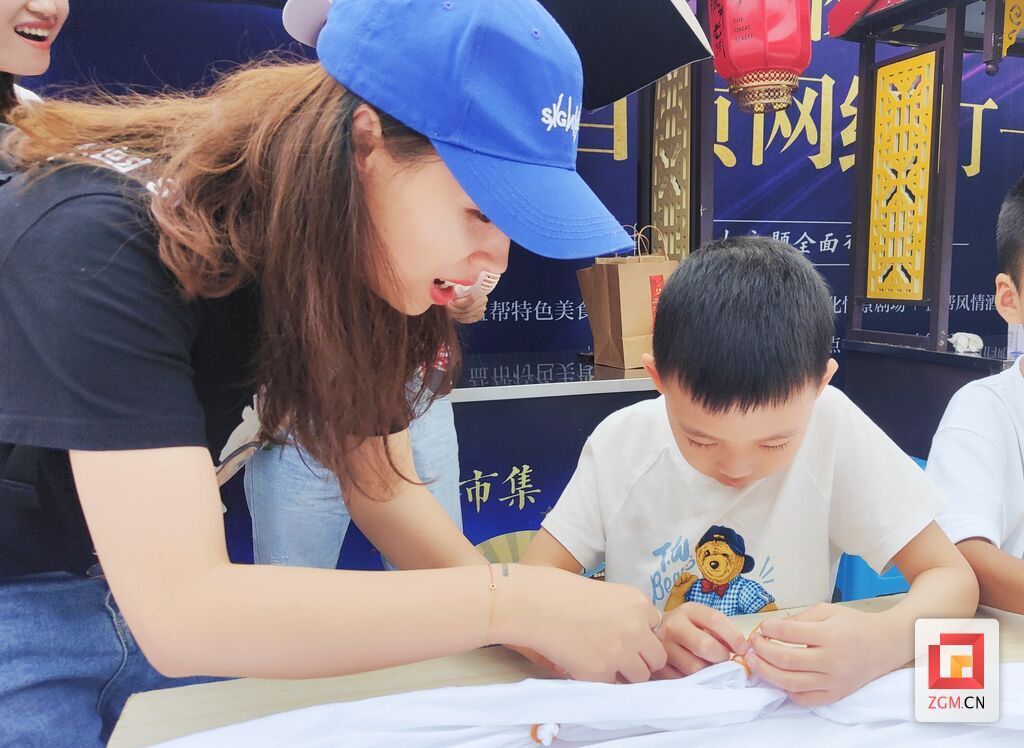 現(xiàn)場的扎染體驗活動中,小朋友們與家長齊心合作,他們用稚嫩的小手在百米白布上扎出不同的小疙瘩,眼神里滿是對扎染作品的期待。