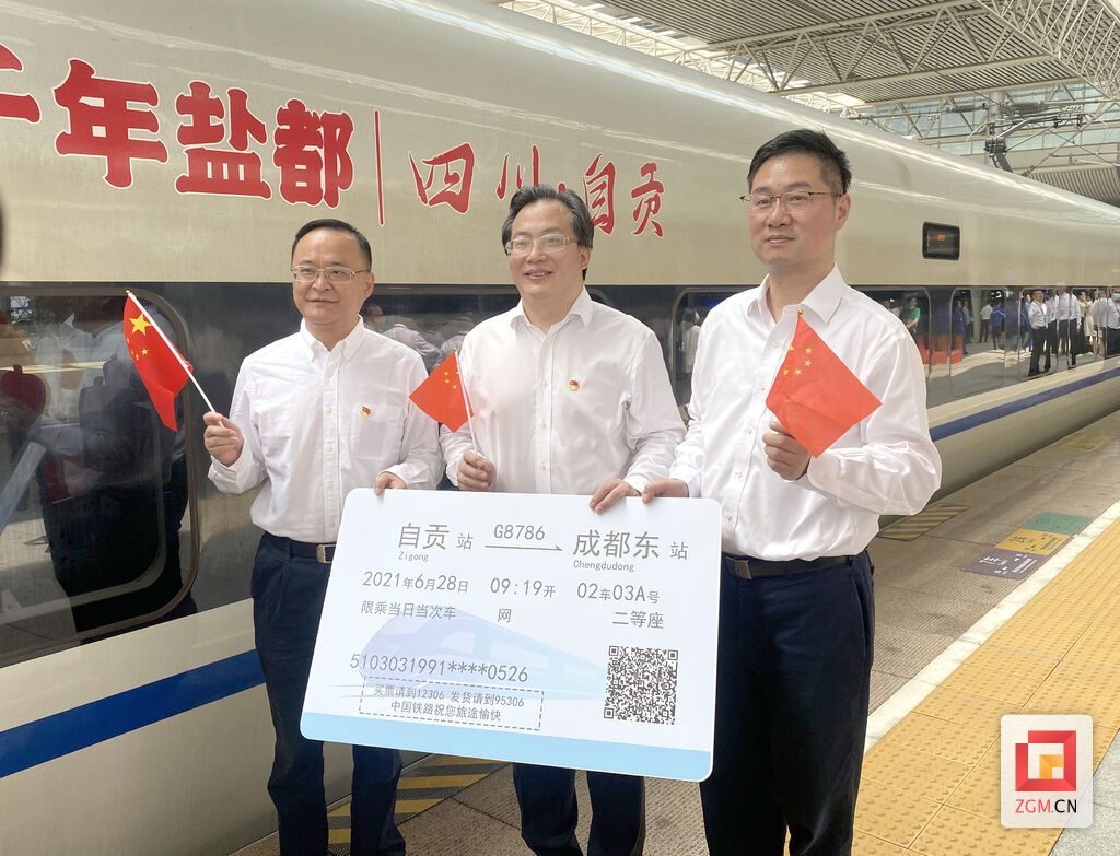 2021年6月28日上午10時(shí)20分,一聲嘹亮的汽笛鳴響,“千年鹽都號(hào)”G8786次專列抵達(dá)成都。400名首乘旅客一路歡歌前行,到達(dá)成都東站,用時(shí)1小時(shí)1分鐘。隨著綿瀘高鐵內(nèi)自瀘段的開通,江姐故里、千年鹽都、恐龍之鄉(xiāng)、中國燈城——自貢,與成都更加“親密”。