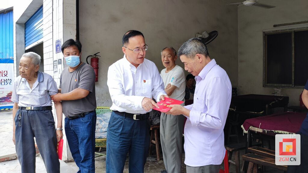 隨后,譚豹向老黨員曾永清頒發(fā)了“光榮在黨50年”紀念章,向他和困難黨員鄧國賓、葉久湘,送上慰問金、慰問品。