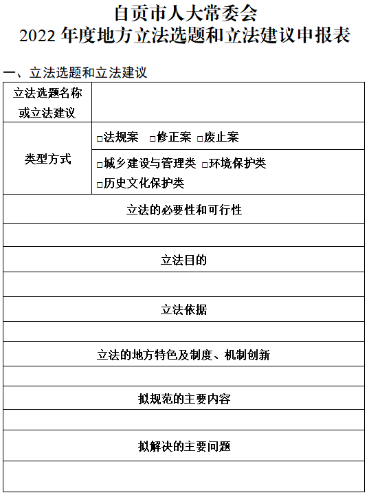 為正確履行市人大常委會(huì)的立法職權(quán),增強(qiáng)地方立法工作的計(jì)劃性,本著民主立法、開(kāi)門(mén)立法的要求,根據(jù)《自貢市地方立法條例》《自貢市人民代表大會(huì)常務(wù)委員會(huì)立法規(guī)劃和年度立法計(jì)劃編制辦法》,決定在全市范圍內(nèi)公開(kāi)征集2022年度地方立法選題和立法建議,歡迎廣大公民、法人和其他組織積極參與?,F(xiàn)將有關(guān)事項(xiàng)公告如下: