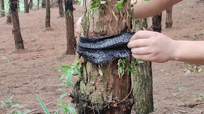 用黑色網(wǎng)袋綁牢根系,使其緊緊貼合樹(shù)皮,簡(jiǎn)單幾步便完成了種植。