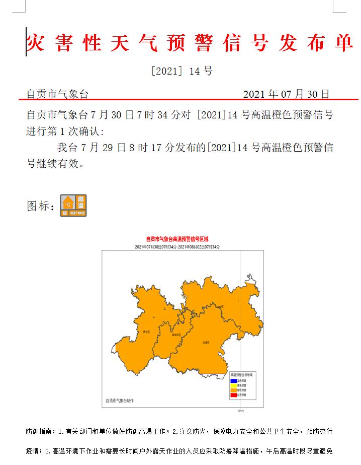 自貢市氣象臺7月30日7時34分對 [2021]14號高溫橙色預警信號進行第1次確認:我臺7月29日8時17分發(fā)布的[2021]14號高溫橙色預警信號繼續(xù)有效。