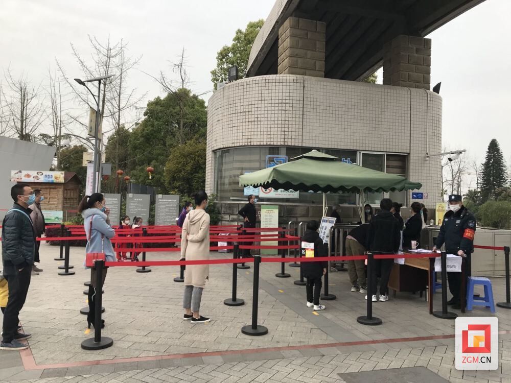 嚴格實行保持社交距離防控措施,在游客中心體溫檢測區(qū)增設(shè)一米線。