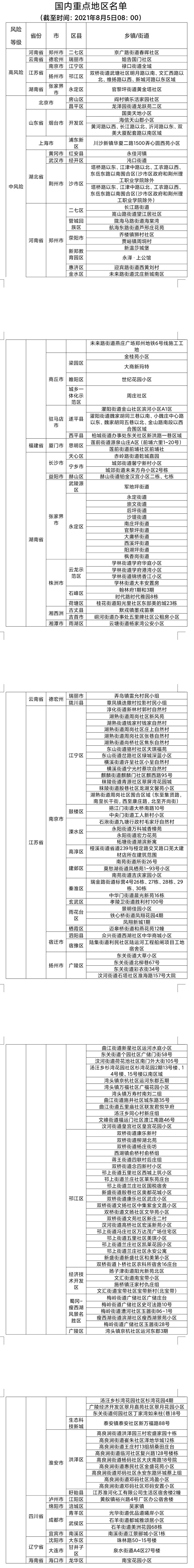 截至2021年8月5日08:00時,全國高風(fēng)險地區(qū)5個,中風(fēng)險地區(qū) 160個。