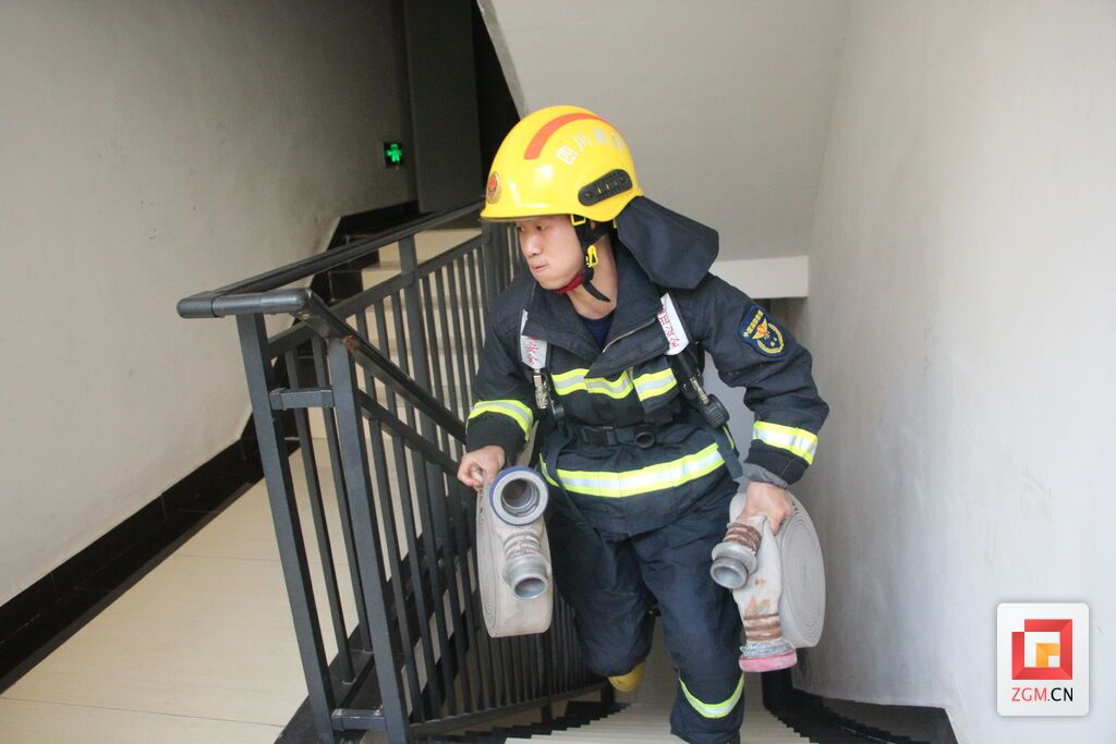 “出去打火我們就是這身裝備,戰(zhàn)斗服一穿,空呼器一背,提上兩盤水帶就開跑……”據(jù)南環(huán)路消防站站長助理黃志強介紹,該項目為模擬高層住宅發(fā)生火災(zāi)、電梯停運,消防指戰(zhàn)員進行救援的場景,參與考核的指戰(zhàn)員負重(身上的戰(zhàn)斗服,背上的空氣呼吸器和手里兩盤水帶)超過了30公斤。