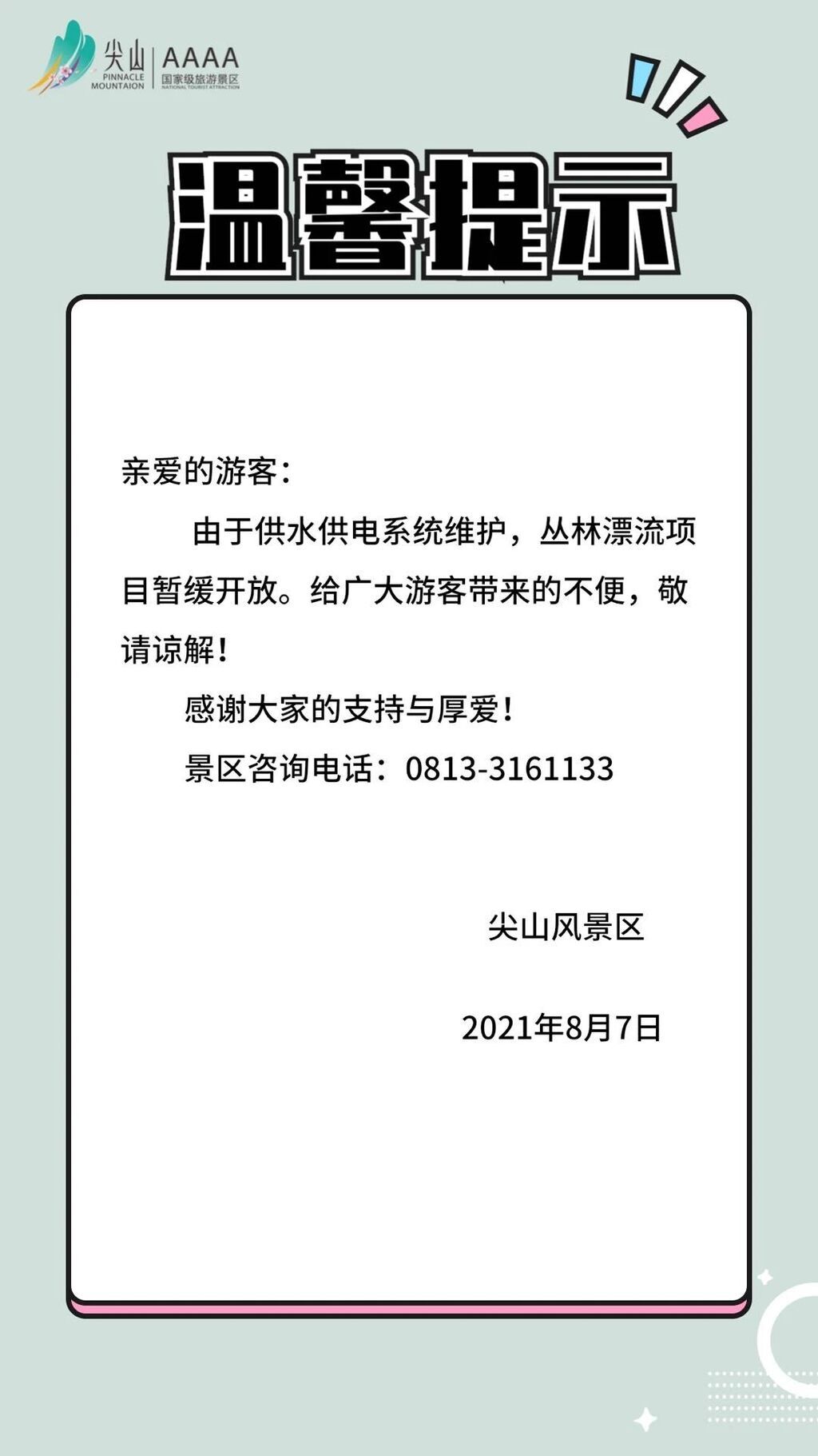 由于供水供電系統(tǒng)維護,尖山風景區(qū)叢林漂流項目暫緩開放。尖山風景區(qū)微信公眾號將第一時間發(fā)布項目開業(yè)時間和相關(guān)優(yōu)惠福利。