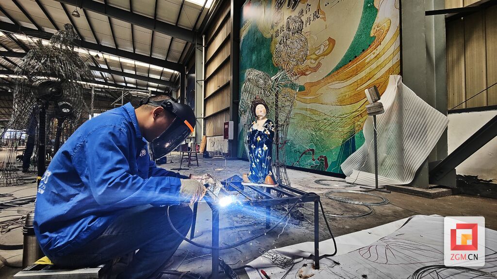 “此次制作的‘唐風(fēng)華韻’系列燈組,共有四座,分別是‘嘯天駱駝’‘勾頭皇家馬’和兩座‘拈花陶俑’,是自貢彩燈與唐三彩兩種非遺技藝的全新融合?!迸c楊勝平一起經(jīng)歷“烤”驗(yàn)的還有藝術(shù)總監(jiān)劉煒?!疤迫适且环N具有中國獨(dú)特風(fēng)格的傳統(tǒng)工藝品,在色彩的相互輝映中,顯出堂皇富麗的藝術(shù)魅力,且自帶歷史沉淀?!眲樈榻B說,本次制作最大難度就在于如何用生硬的鐵絲,表現(xiàn)出唐三彩經(jīng)過歷史打磨的神韻。