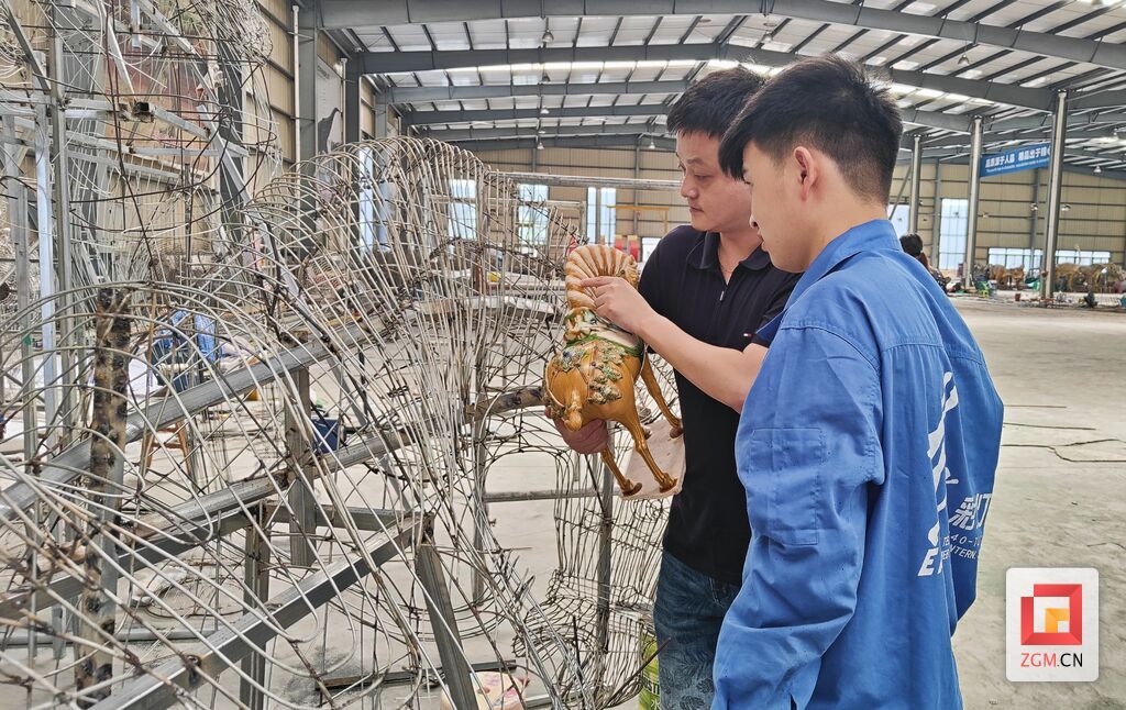 因安全保障所需,造型師們穿著長袖長褲,面帶防護(hù)面具作業(yè)?!榜R身上的毛發(fā)深淺不一,每只腳蹄形態(tài)也不一樣,這都需要我們用鐵絲造型表現(xiàn)出來?!痹跅顒倨角胺綌[放著唐三彩陶瓷和一張張?jiān)O(shè)計(jì)圖紙,為了達(dá)到高精度還原,他會(huì)無數(shù)次地邊看、邊研究、邊修改,劉煒也會(huì)時(shí)常在他的工作中起到“點(diǎn)睛”的作用。