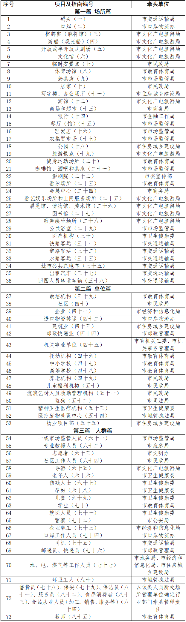 為抓好國務(wù)院應(yīng)對(duì)新冠肺炎疫情聯(lián)防聯(lián)控機(jī)制綜合組印發(fā)的《重點(diǎn)場所重點(diǎn)單位重點(diǎn)人群新冠肺炎疫情常態(tài)化防控相關(guān)防護(hù)指南》(聯(lián)防聯(lián)控機(jī)制綜發(fā)〔2021〕82號(hào),以下簡稱《指南》)各項(xiàng)疫情防控措施的落地落實(shí),經(jīng)市領(lǐng)導(dǎo)小組同意,就《指南》中各類場所、單位、人群的牽頭責(zé)任單位進(jìn)行明確(見文末),并提出以下要求一并貫徹落實(shí)。