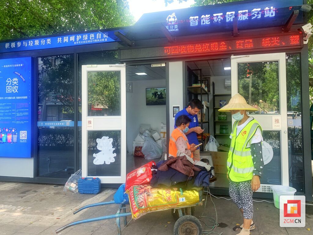 8月19日,大安區(qū)龍井街道華大社區(qū)廣場旁的主干道上,一座“科技感”十足的玻璃房吸引了不少路過群眾的目光?!凹垰?公斤1.5元,書籍1公斤4元,塑料瓶1公斤1.5元……”在智慧垃圾分類服務(wù)站,現(xiàn)場工作人員一邊記錄分好類的垃圾重量,一邊向群眾報(bào)著收購的價(jià)格?!案鞣N物品的回收價(jià)格都在這里,根據(jù)市場價(jià)格會有一定變化?!绷硪幻ぷ魅藛T指著電子屏上的報(bào)價(jià)表,向咨詢的群眾作說明。