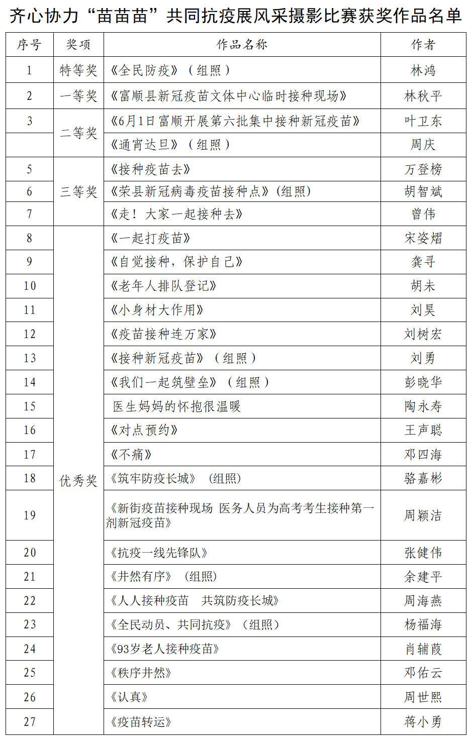 本次攝影比賽,共收到全市攝影家和攝影愛好者61人投稿,征集原創(chuàng)作品495幅(組),其中單幅作品468幅,組照27組。經(jīng)專家評(píng)選,林鴻拍攝的《全民防疫》(組照)獲特等獎(jiǎng);林秋平拍攝的 《富順縣文體中心新冠疫苗臨時(shí)接種現(xiàn)場(chǎng)》獲一等獎(jiǎng);葉衛(wèi)東、周慶拍攝的《6月1日富順開展第六批集中接種新冠疫苗》《通宵達(dá)旦》(組照)分獲二等獎(jiǎng);萬登榜、胡智斌、曾偉拍攝的《接種疫苗去》《榮縣新冠病毒疫苗接種點(diǎn)》(組照)、《走!大家一起接種去》分獲三等獎(jiǎng);宋姿熠、龔尋等20人的作品獲優(yōu)秀獎(jiǎng)。(熊心權(quán))