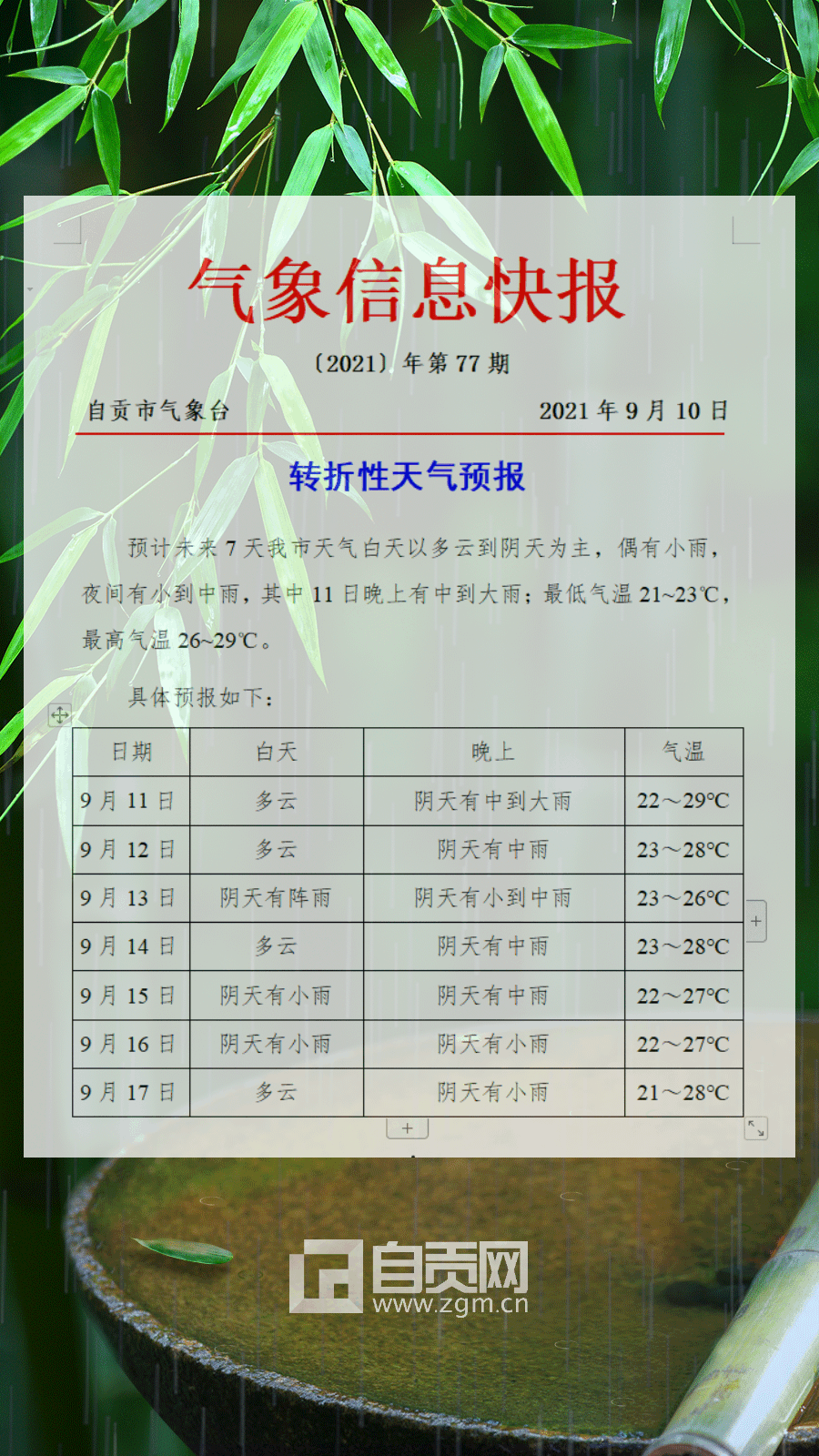 9月10日,自貢市氣象臺(tái)發(fā)布轉(zhuǎn)折性天氣預(yù)報(bào),預(yù)計(jì)未來(lái)7天我市天氣白天以多云到陰天為主,偶有小雨,夜間有小到中雨,其中11日晚上有中到大雨;最低氣溫21~23℃,最高氣溫26~29℃。