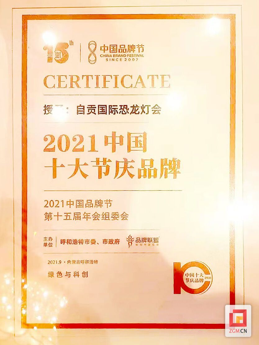 9月11日晚,在呼和浩特舉辦的2021第十五屆中國(guó)品牌節(jié)年會(huì)上,相繼發(fā)布了2021《中國(guó)品牌500強(qiáng)》、《華譜榜》、《中國(guó)十大節(jié)慶品牌》等榮譽(yù)榜單。自貢國(guó)際恐龍燈會(huì)榮登“中國(guó)十大節(jié)慶品牌”。