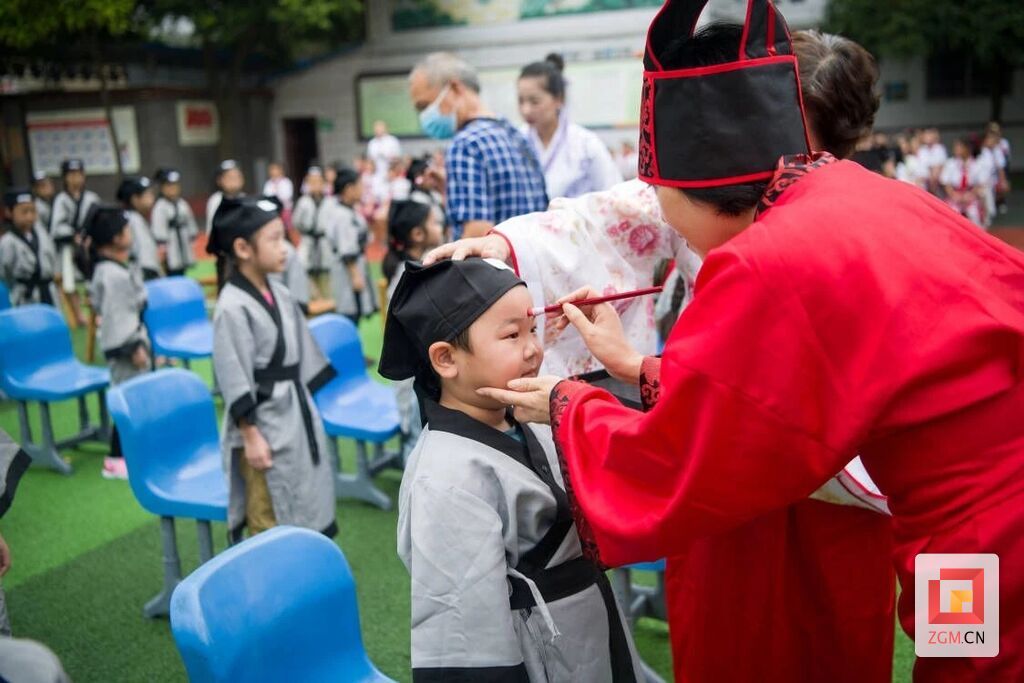 活動(dòng)伊始,在廣華山小學(xué)500名學(xué)生的見(jiàn)證下,150名身著漢服的一年級(jí)受禮新生整齊入場(chǎng)。隨著鼓樂(lè)聲響起,受禮程序正式開(kāi)啟。正衣冠、朱砂開(kāi)智、啟蒙描紅、祭拜先師、擊鼓明志……孩子們有條不紊地進(jìn)行著每一個(gè)步驟,心靈經(jīng)受了一次莊重的洗禮。