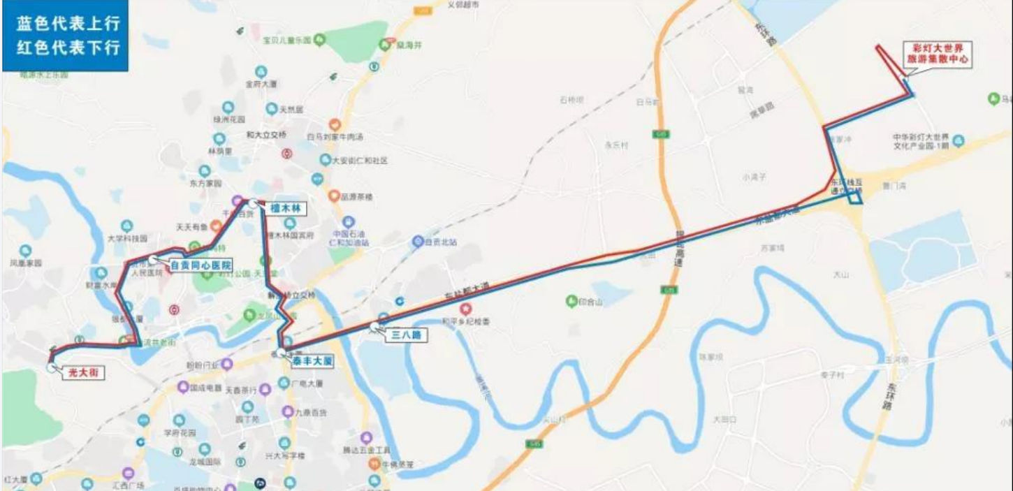該線路由光大街始發(fā),經(jīng)自貢同心醫(yī)院—檀木林—泰豐大廈—三八路至彩燈大世界旅游集散中心,全程27公里。