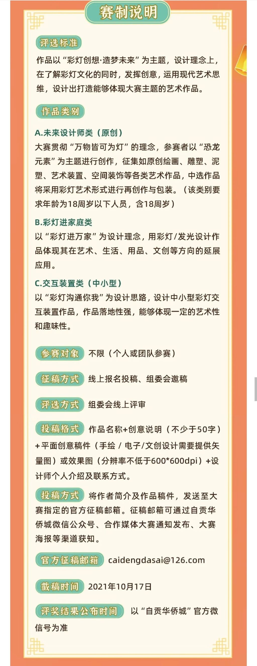 9月30日,記者從自貢華僑城獲悉,第二屆彩燈創(chuàng)意大賽現(xiàn)已拉開帷幕,進入作品征集階段。優(yōu)秀作品不僅有機會列入2022年中華彩燈大世界“創(chuàng)想美燈匯”主題區(qū)域展出計劃,還有機會獲得最高6000元的獎金。