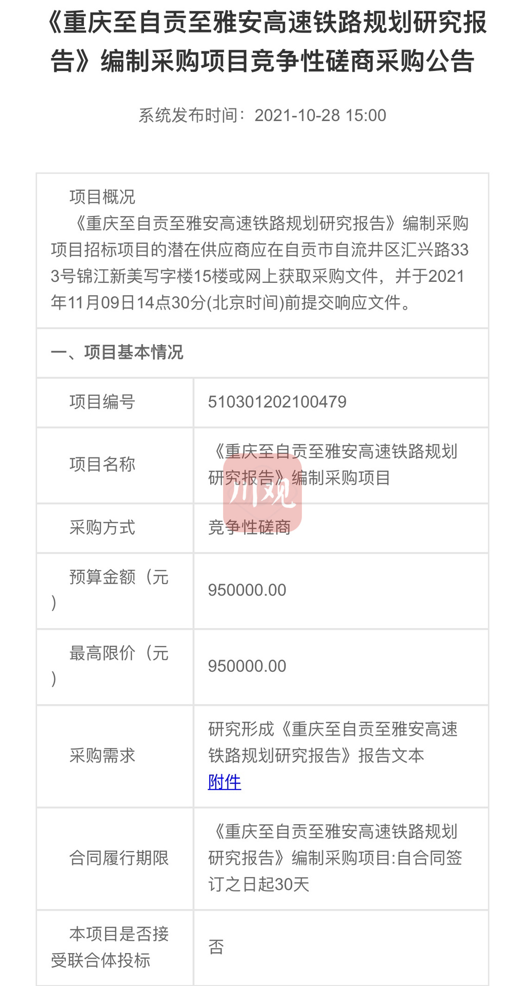 11月1日,川觀新聞?dòng)浾邚恼_網(wǎng)站得知,《重慶至自貢至雅安高速鐵路規(guī)劃研究報(bào)告》編制采購項(xiàng)目競(jìng)爭(zhēng)性磋商采購公告已于近期發(fā)布。該項(xiàng)目納入了《成渝地區(qū)雙城經(jīng)濟(jì)圈建設(shè)規(guī)劃綱要》,由自貢市發(fā)展改革委牽頭進(jìn)行前期研究。