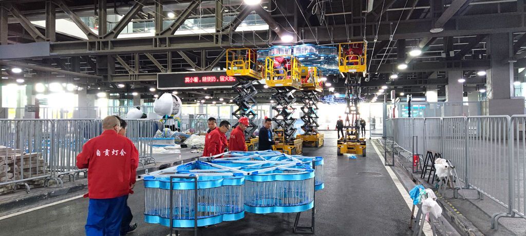 9月5日起,100余名自貢彩燈非遺大師和工匠們開始加班加點(diǎn)進(jìn)行燈組制作,后期又派了60多名工匠到上?,F(xiàn)場(chǎng)進(jìn)行安裝調(diào)試。最終于10月23日完成安裝。