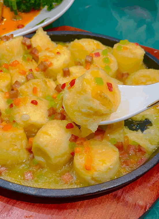 內(nèi)里軟糯,滿滿的汁水充斥其中,豆腐嫩的像雞蛋羹一樣,吃起來(lái)滑滑的軟軟的,都不需要咀嚼,抿一口就在嘴里融化了。