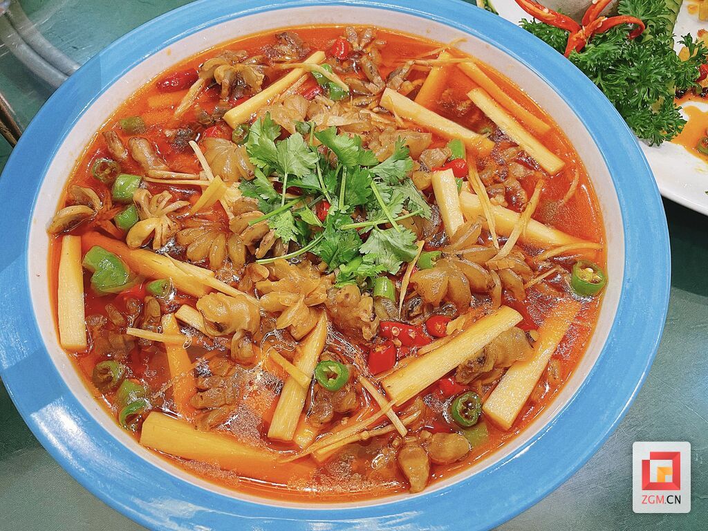 把煮熟的羊雜切成條,用鹽幫菜做法做成的麻辣羊雜,口感厚重、爽彈。