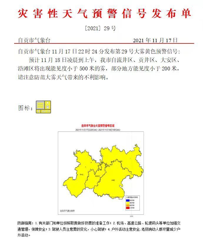 11月17日22時(shí)24分,自貢市氣象臺(tái)發(fā)布大霧黃色預(yù)警:預(yù)計(jì)11月18日凌晨到上午,我市自流井區(qū)、貢井區(qū)、大安區(qū)、沿灘區(qū)將出現(xiàn)能見度小于500米的霧,部分地方能見度小于200米,請(qǐng)注意防范大霧天氣帶來的不利影響。