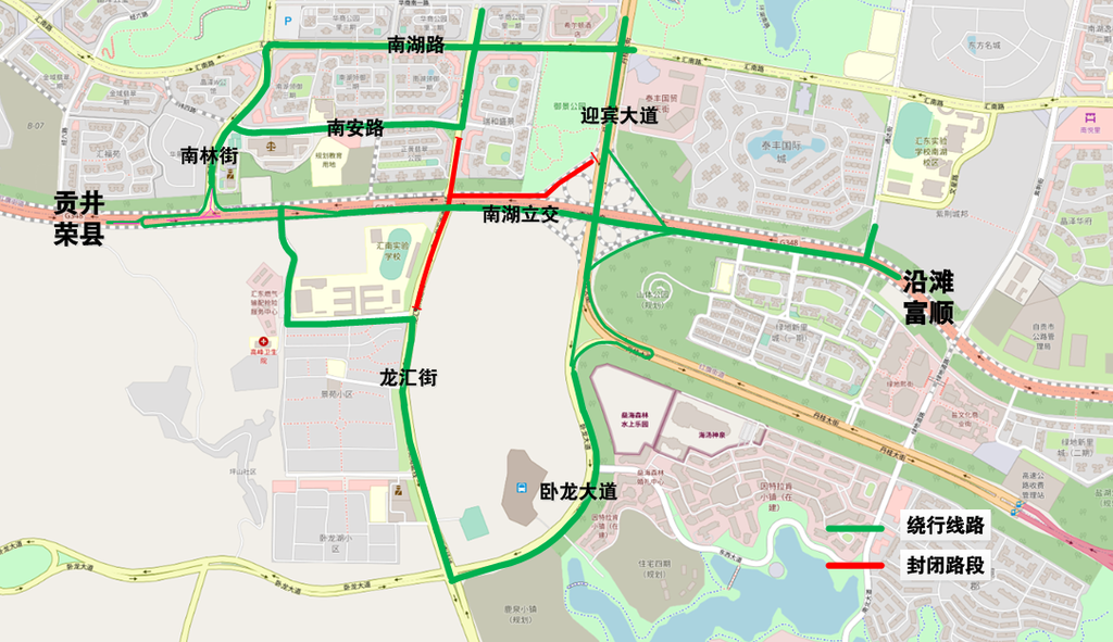 (一)過往車輛根據(jù)交通標(biāo)識可選擇南湖立交、臥龍大道、迎賓大道、南湖路、南林街、南安路等道路繞行。