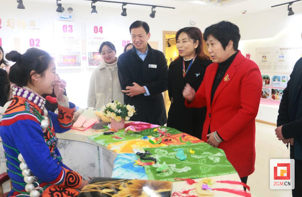 授牌儀式結(jié)束后,市委統(tǒng)戰(zhàn)部常務(wù)副部長丁琴等一行參觀了學(xué)院民族團結(jié)進步愛國主義教育基地,并與現(xiàn)場制作剪紙、秸稈畫、扎染的民族學(xué)生進行了交流。