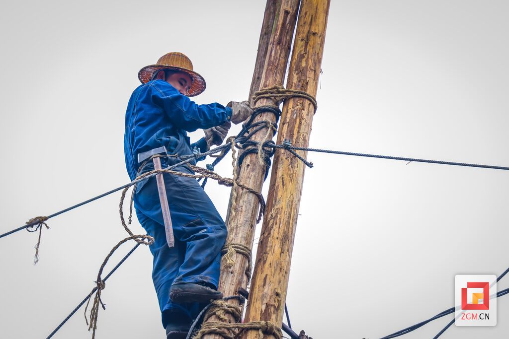 “天車(chē)的用材為杉樹(shù)原木,這次復(fù)建用到了86根長(zhǎng)度在5米至8米的杉木?!秉S澤章介紹說(shuō),天車(chē)就是將若干杉木通過(guò)加工、排列、圍攏、接逗、用篾索或鋼繩捆扎、加工木楔楔緊后,自下而上按照“外圓內(nèi)空”“上小下大”的原理合圍排列捆扎而成。