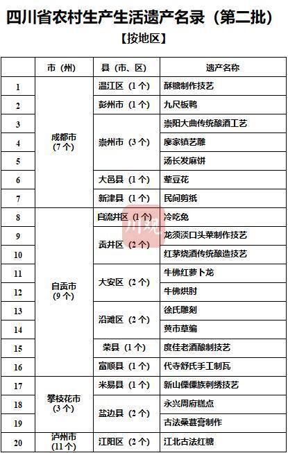 1月11日,四川省農(nóng)業(yè)農(nóng)村廳發(fā)布了四川省第二批農(nóng)村生產(chǎn)生活遺產(chǎn)名錄,溫江酥糖制作技藝、大邑葷豆花、自流井冷吃兔等145個項目入選。
