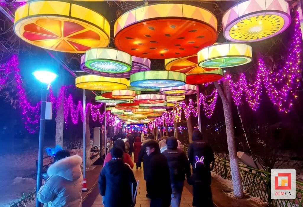 “西瓜”“橙子”“獼猴桃”……走進(jìn)人民公園,迎面就是“果香四溢”的彩燈長(zhǎng)廊。頭頂上一組組水果切片造型的燈組,與兩側(cè)行道樹上點(diǎn)綴的燈光相互映襯,為冬夜的公園增添了一派喜慶氣氛。不遠(yuǎn)處雪地上,鮮艷的“花朵”、嫩綠的“荷葉”、逼真的“天鵝”、可愛的“老虎”……各式彩燈盡情展示著冬夜的魅力與精彩,引得不少游客駐足合影。