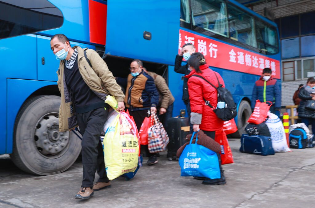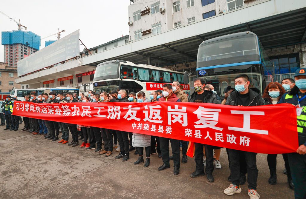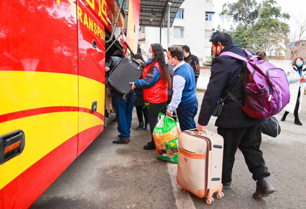 春節(jié)長假結(jié)束,各地迎來返崗返工高峰。2月8日上午8點30分,150名外出務(wù)工人員陸續(xù)乘坐榮縣政府組織的車輛來到榮縣南門汽車站,經(jīng)過掃碼測溫、安全檢查等防疫措施后進入車站。此時,車身上張貼著“春風送暖返崗行 金通暢達溫馨情”紅色橫幅的3輛超長客運專車已經(jīng)在車站停靠好,等待返崗人員通過“川行通”登記信息后,分別前往深圳、莆田和溫嶺。