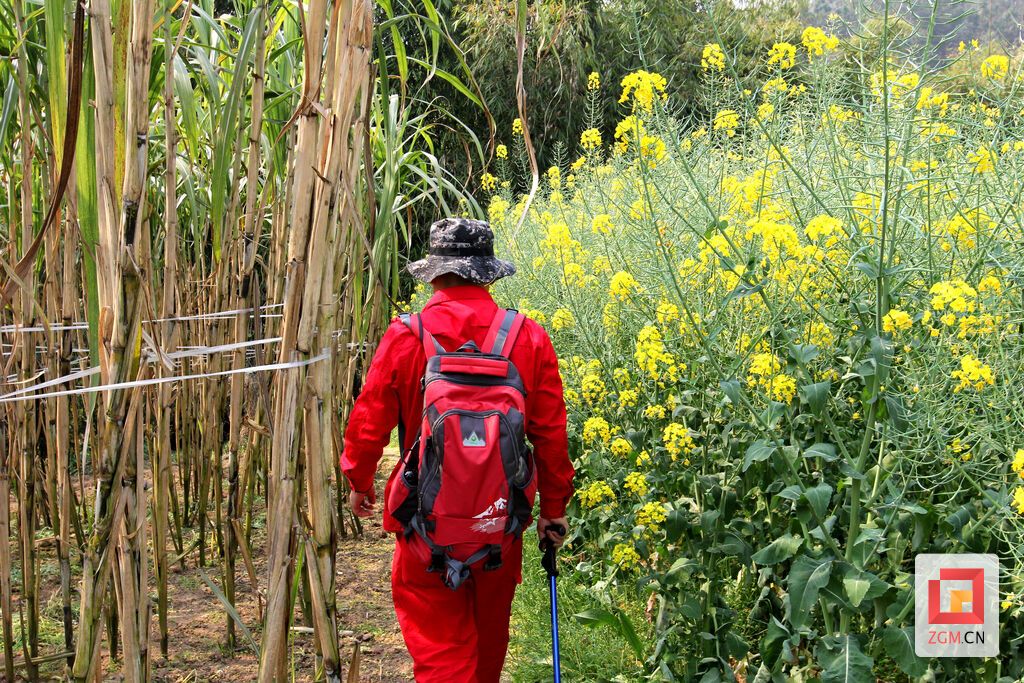 遠(yuǎn)處的田埂上,身著紅色工裝的屈剛走起路來特別得勁兒。
