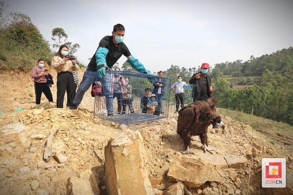 “飛了,飛起來了?!?月8日上午,在榮縣雙古鎮(zhèn),一只禿鷲在工作人員的幫助下緩緩走出鳥籠,一番“試探”后,它張開了2米多的雙翼,從一處小山坡頂俯沖而下,飛向林間,引來現(xiàn)場群眾一陣歡呼。這是自貢市首次救助禿鷲并成功放飛野外。