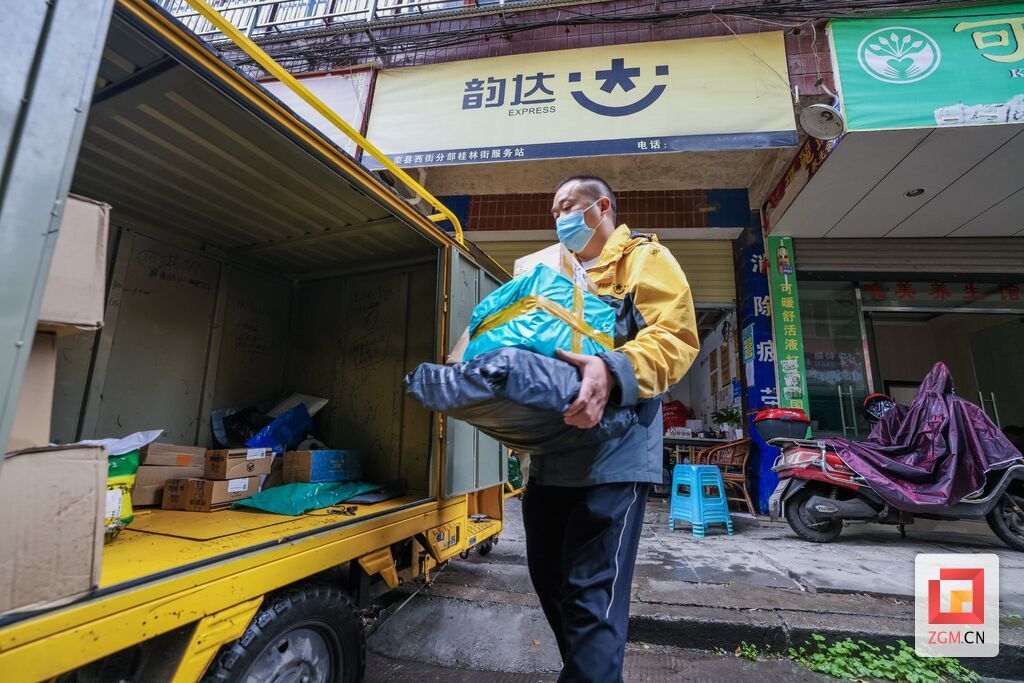 4月14日,韻達(dá)快遞榮縣縣城西街分部桂林街服務(wù)站,片區(qū)負(fù)責(zé)人張希勇正在和其他快遞員一起搬運(yùn)包裹。