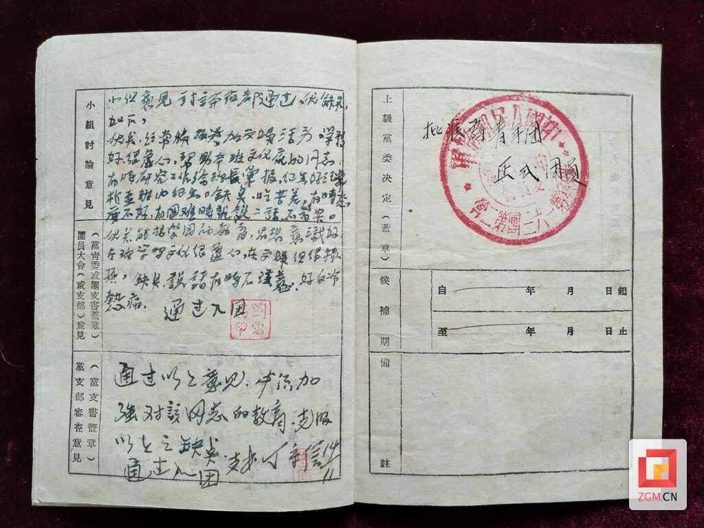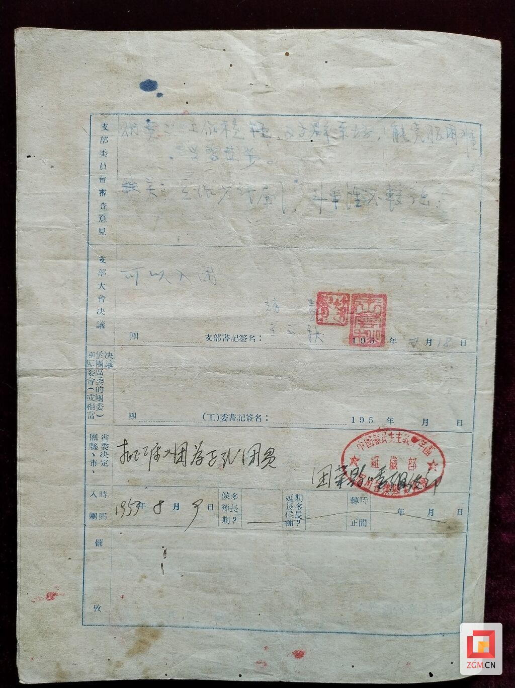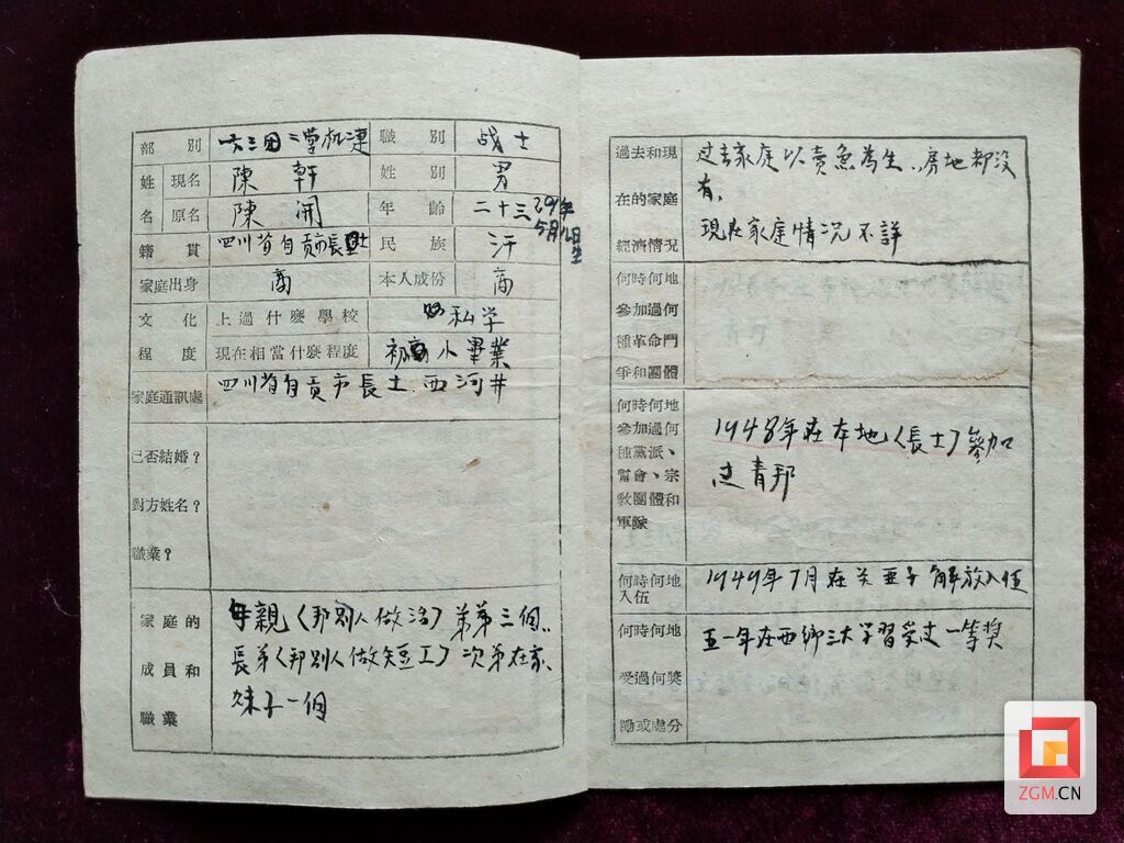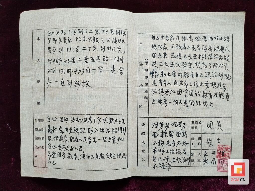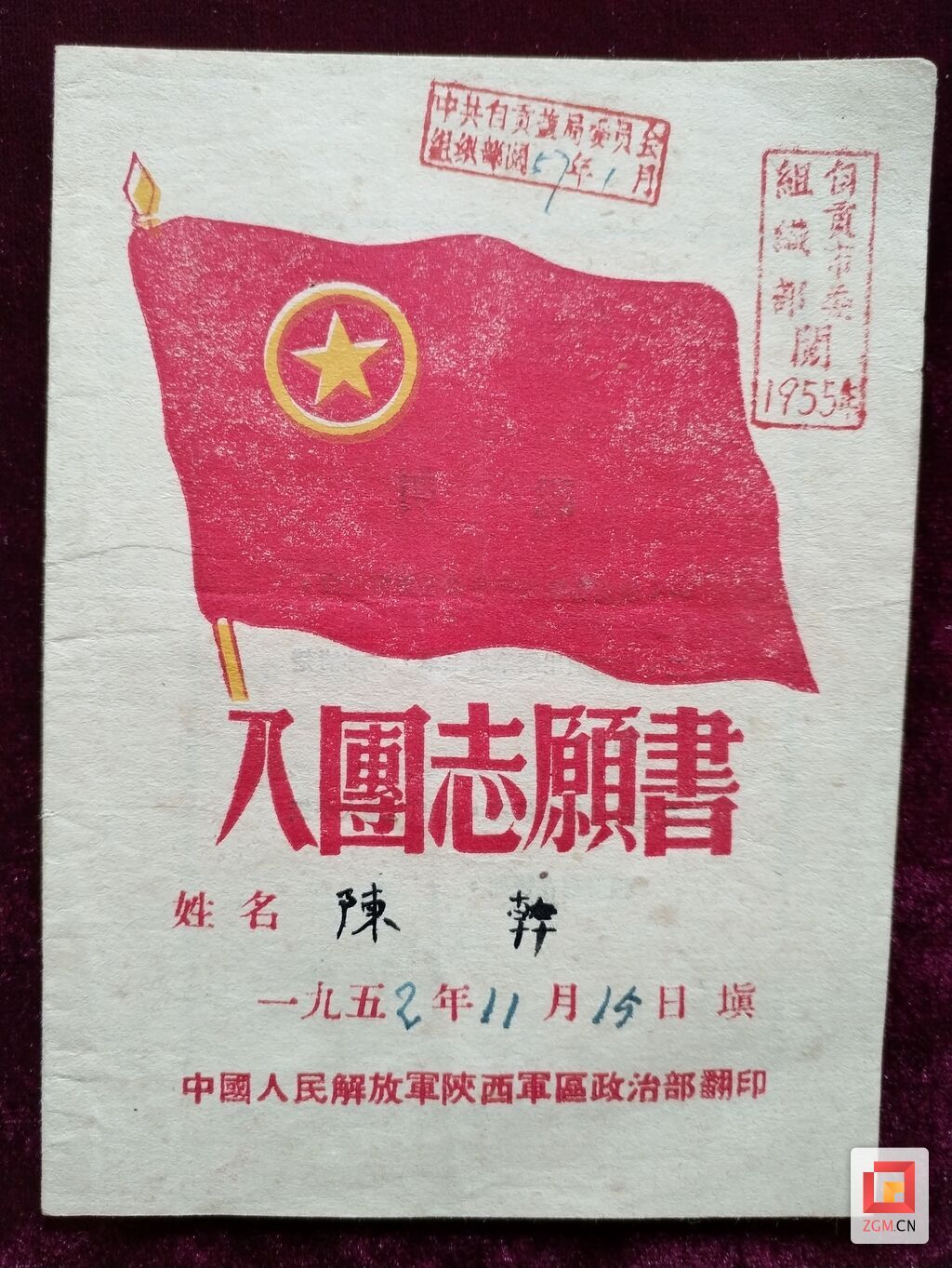 第二份《入團志愿書》為小32開本,封面是一面迎風飄揚的團旗,填發(fā)日期為1952年11月15日,扉頁為入團誓詞。主人為自貢籍軍人陳干,1949年7月入伍,入團的動機是:“為了實現(xiàn)新民主主義社會,更認識到入團后能得到很快進步,能為人民多出一些力量,把自己貢獻與人民”。軍人的入團由團員大會通過后,還要由黨委會批準才能成為正式的團員。