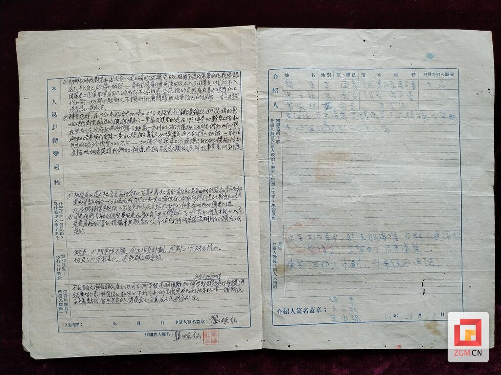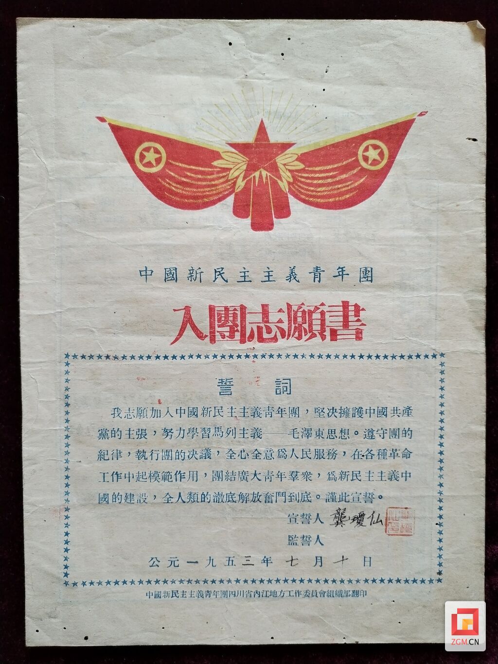 第一份《入團志愿書》為16開本,合計8頁,封面正中是一枚五角星和兩面鮮紅的團旗,下面是入團誓詞和宣誓人的姓名和印章,填發(fā)日期是1953年7月10日。主人為榮縣東興鎮(zhèn)(原墨林鄉(xiāng))的村校女教師龔瑗仙,《入團志愿書》上這樣寫道:“祖國真正建立社會主義社會和共產(chǎn)主義社會的責任就是要由我們這批青年來擔當,我是青年中的一分子,因此我有信心和決心靠近自己的組織得到黨的教育和培養(yǎng),把我鍛煉得更加堅強,以完成黨和人民交給我們的任務,為此我必須要入團”。