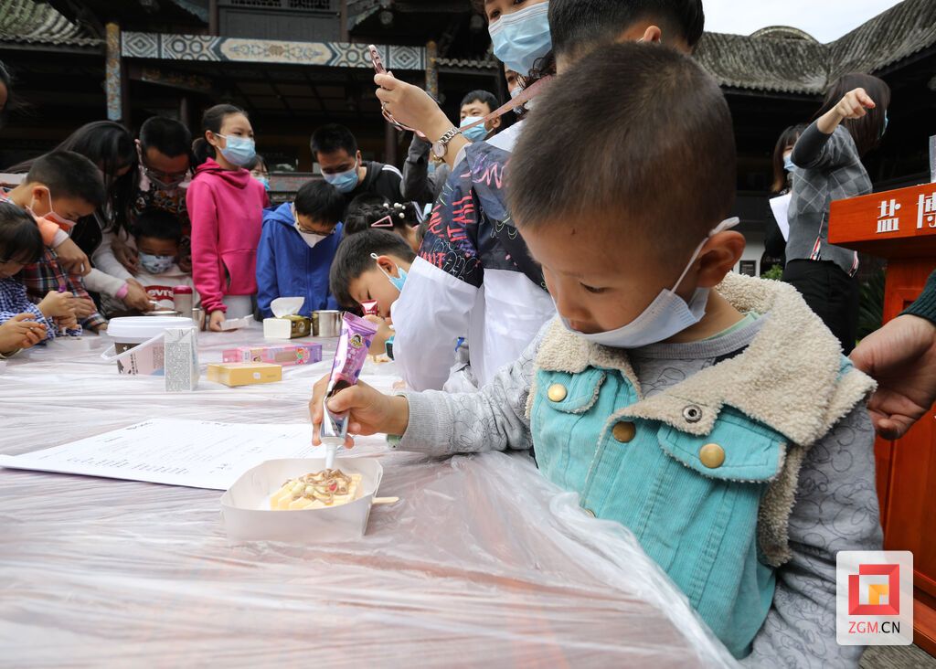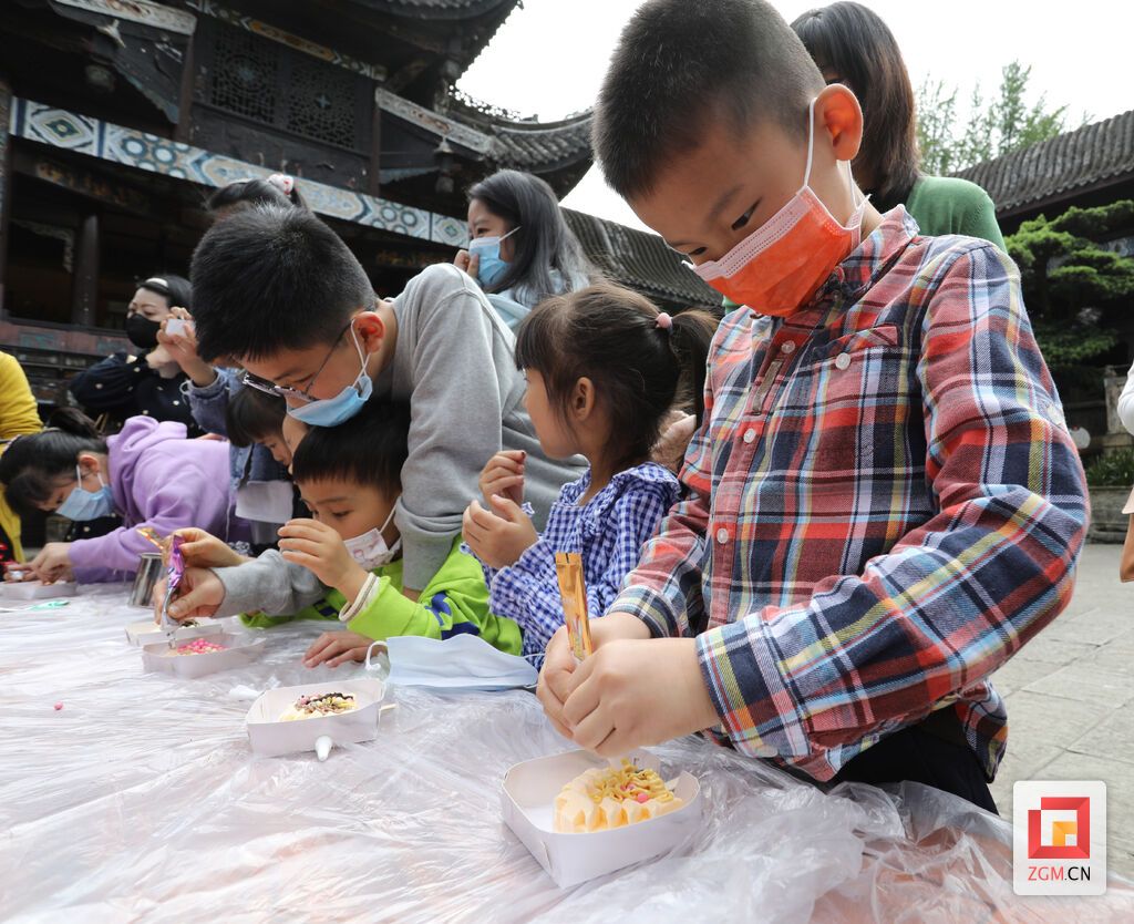 當(dāng)天,工作人員詳細(xì)介紹了自貢的鹽業(yè)歷史、建筑特色、生產(chǎn)工藝等,用講解激發(fā)了少年兒童對(duì)家鄉(xiāng)的熱愛。隨后,在工作人員指導(dǎo)下,孩子們用糖豆、果脯、奶油等材料,在雪糕上繪出了各式圖樣,有的是一張笑臉,有的是一片彩虹,有的是家人合影,既富有想象,又充滿童趣。