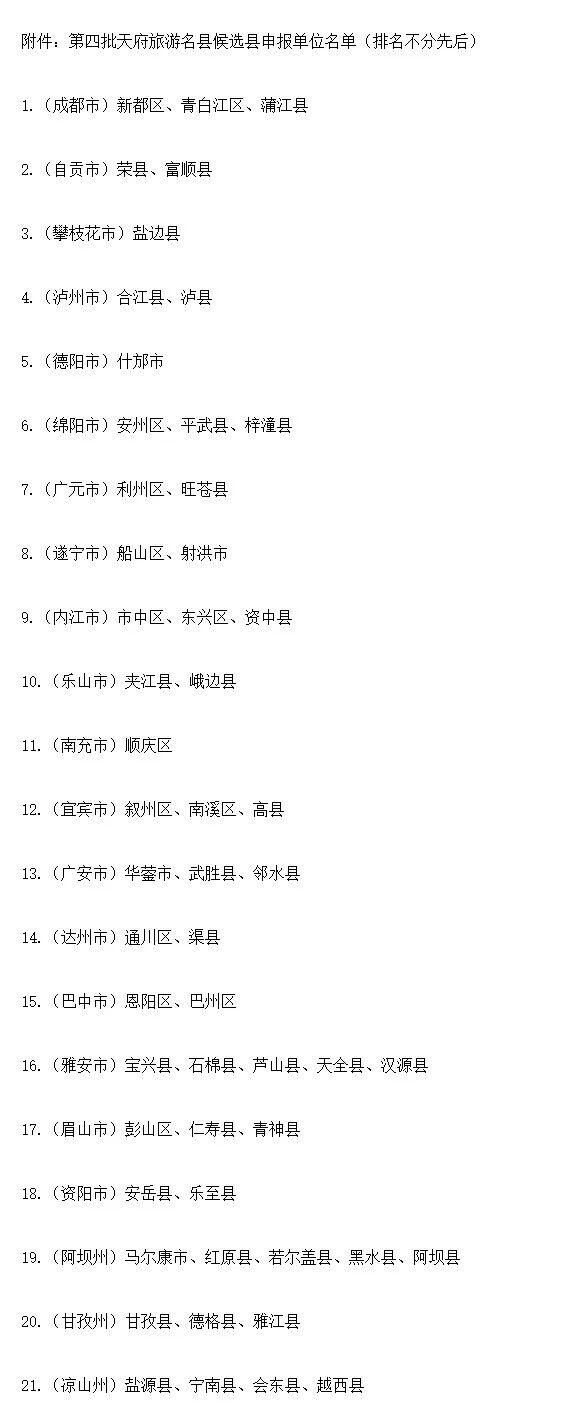 5月11日,四川省文化和旅游廳發(fā)布《關于第四批天府旅游名縣候選縣申報單位初審結果的公告》。