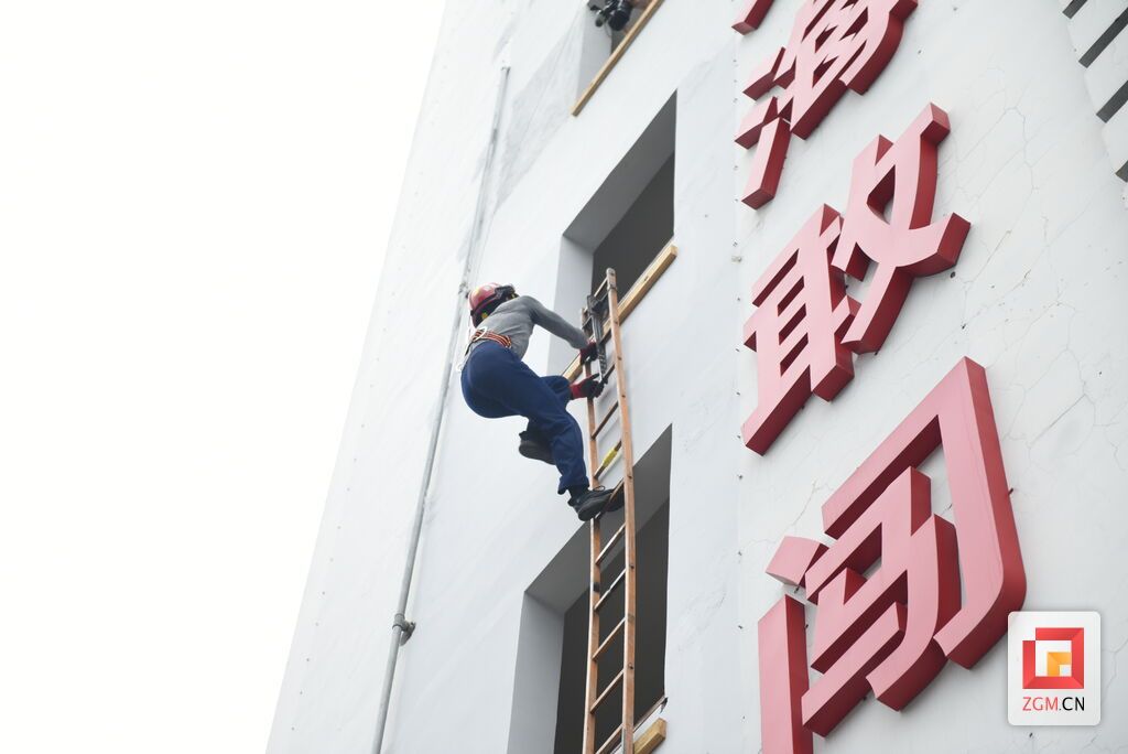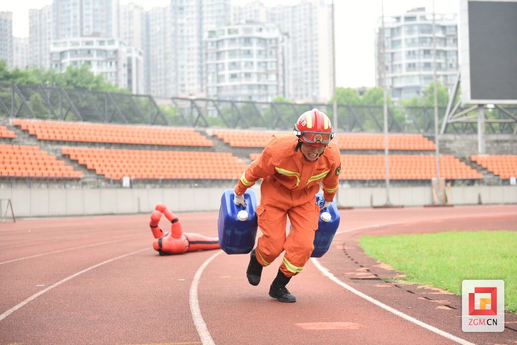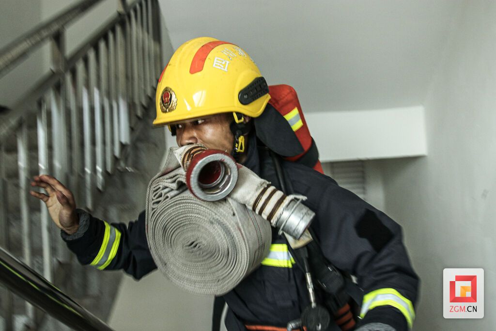 在自貢地標建筑泰豐國貿中心,17名身著全套戰(zhàn)斗服、背著空呼器、攜帶兩盤水帶(負重超過30公斤)的隊員們,正在進行“負重登10樓”項目訓練。