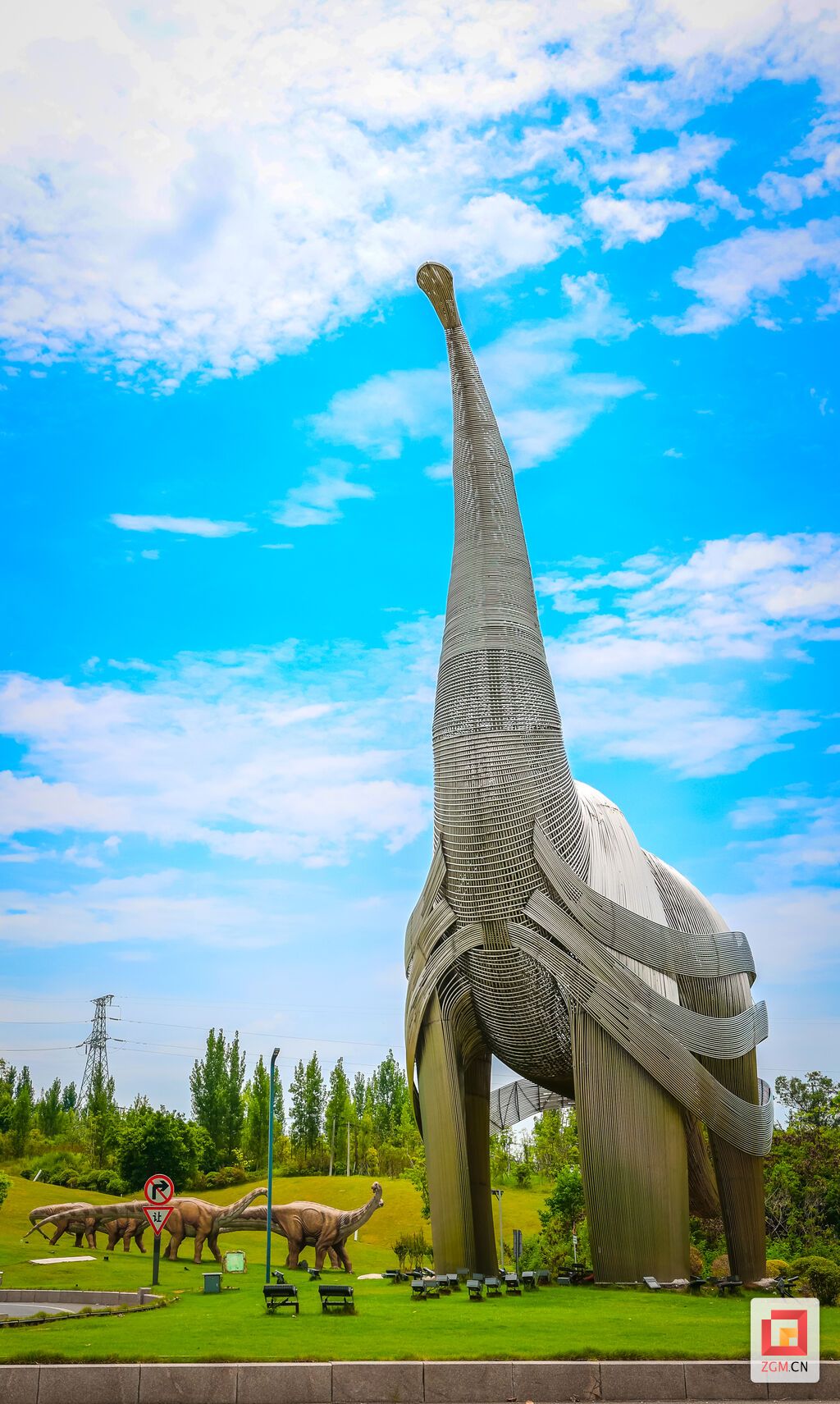 藍(lán)天白云下,一只挺立身軀的鋼架恐龍分外惹眼,其身后還有一群恐龍在草地休閑漫步。